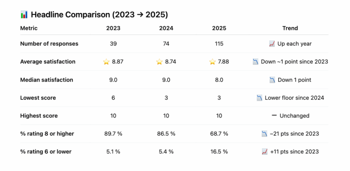 - What we’ve seen is that, as the event has grown, satisfaction has dipped slightly. From 2023 to 2024 it declined a little, and this year it dropped by about one point. Our overall satisfaction score was 7.9 out of 10, down from 8.8 when we first ran this event in in 2023. The median score – which represents the midpoint of all responses – also fell from 9/10 to 8/10.